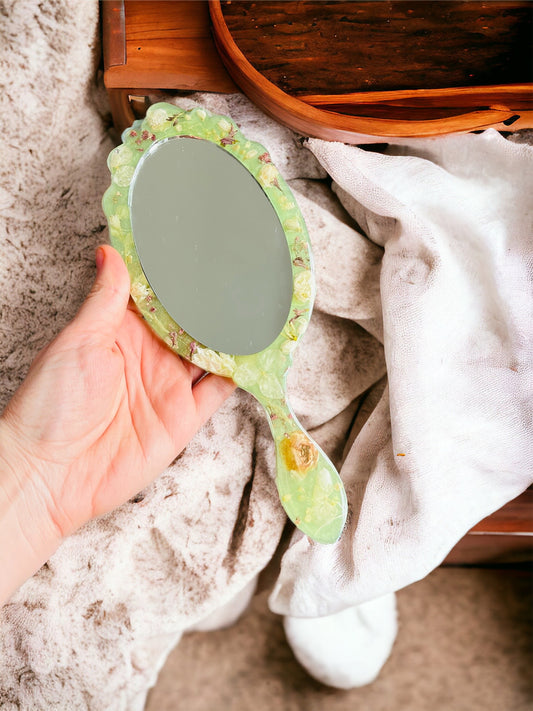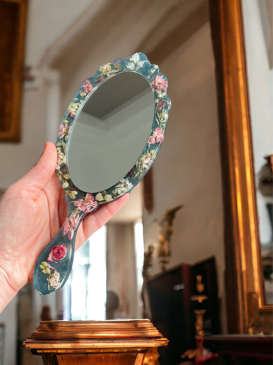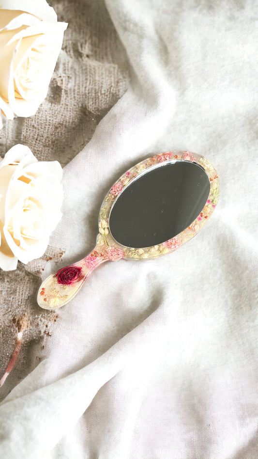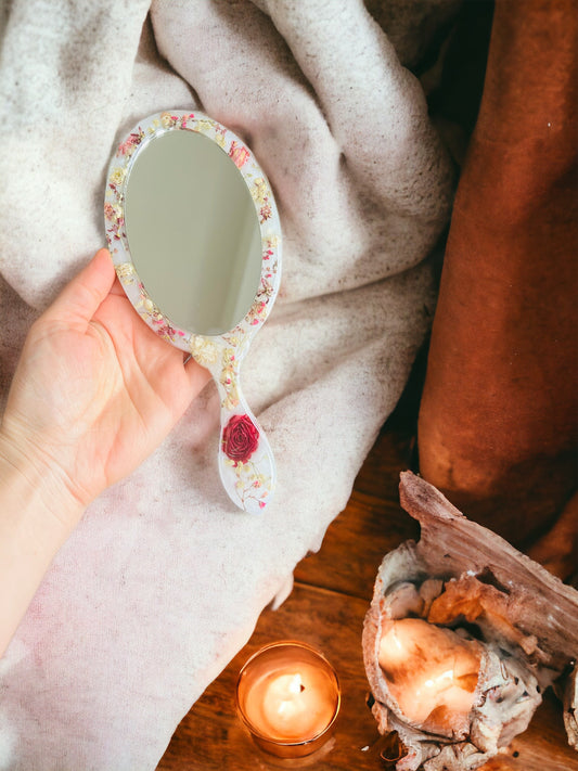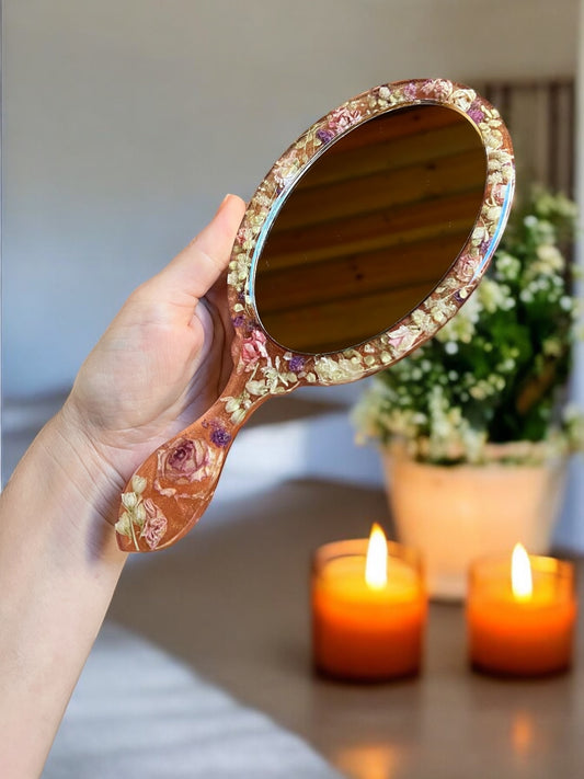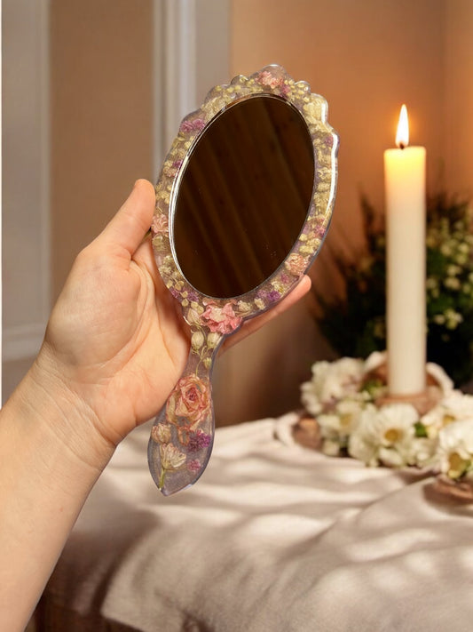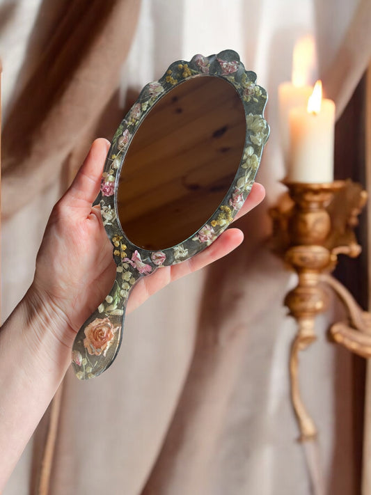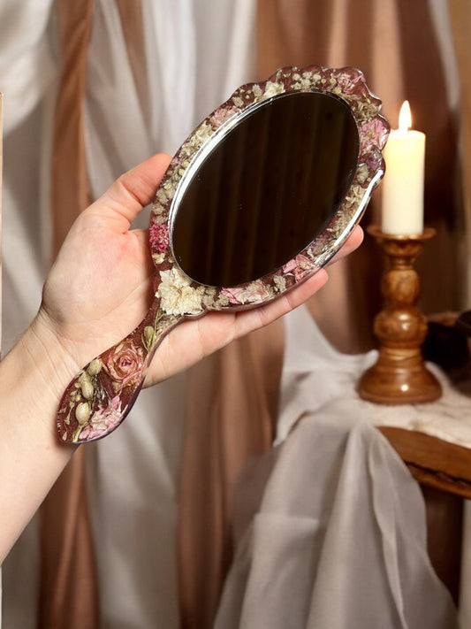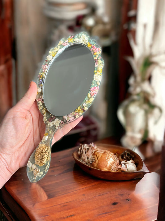 Eleganter handgefertigte Handspiegel , mit getrockene echte Blumen, Royales Design, Deko, Epoxidharz.
